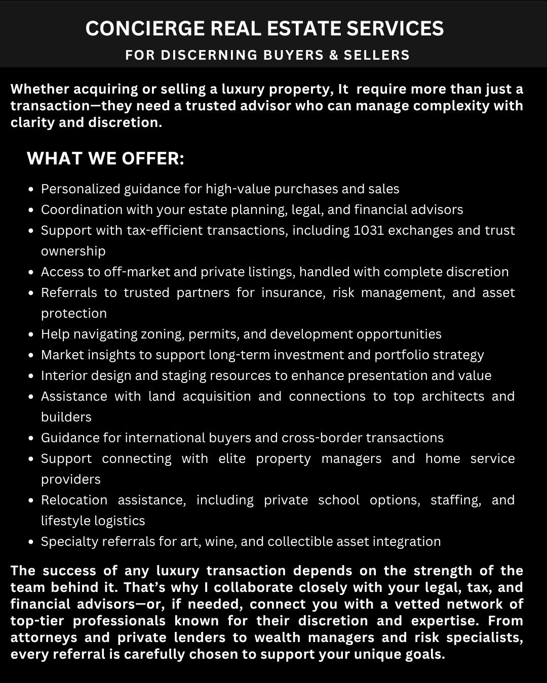 Luxury real estate demands more than a standard transaction—it requires strategic guidance, total discretion, and seamless execution. Whether you're acquiring a legacy estate or preparing to sell a high-value property, I offer concierge-level service tailored to vision. From estate planning and tax efficiency to privacy, asset protection, and investment strategy—I coordinate with your legal and financial team to ensure every move aligns with your broader goals. Don’t have an advisory team in place? I can connect you with a trusted network of elite professionals—from attorneys and tax experts to wealth managers and private insurers.